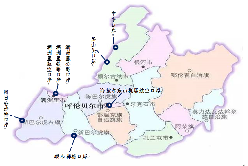 呼伦贝尔市南部与兴安盟相连、东部以嫩江为界与黑龙江省大兴安岭为邻,北和西北部以额尔古纳河为界与俄罗斯接壤,西和西南部同蒙古国交界。边境线总长1733.32公里(其中中俄边界1051.08公里、中蒙边界682.24公里),有8个正式对外开放的国家级口岸(其中有6个边境陆路口岸和2个航空口岸)。此次调研组实地参观了位于新巴尔虎右旗的阿日哈沙特口岸(对蒙口岸)、位于满洲里市的满洲里口岸(对俄口岸)以及位于额尔古纳市的黑山头口岸(对俄口岸)。