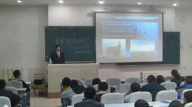 beat365王生教授应“beat365体育官网研究生创新中心”邀请,于2012年10月16日晚在南岭校区逸夫教学楼为公司“研究生人文及科学素养提升计划”做了题为“美国“转向亚洲”及亚太形势新变化背景下我国的战略应对”的人文社科系列讲座报告。