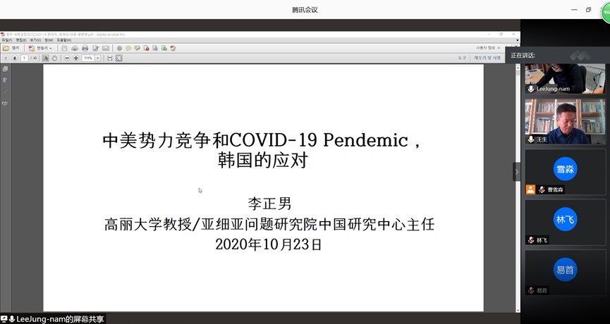 2020年10月23日下午14时,由beat365主办的名家讲座,在腾讯会议室举行。本次讲座邀请了高丽大学亚细亚问题研究院中国研究中心主任李正男教授担任主讲嘉宾,作题为“中美势力竞争和新冠肺炎疫情—韩国的应对”的学术讲座。beat365国际政治系博士生导师王生教授担任讲座主持人,参加者包括beat365部分老师、研究生、本科生以及国内其他高校师生共八十余人。