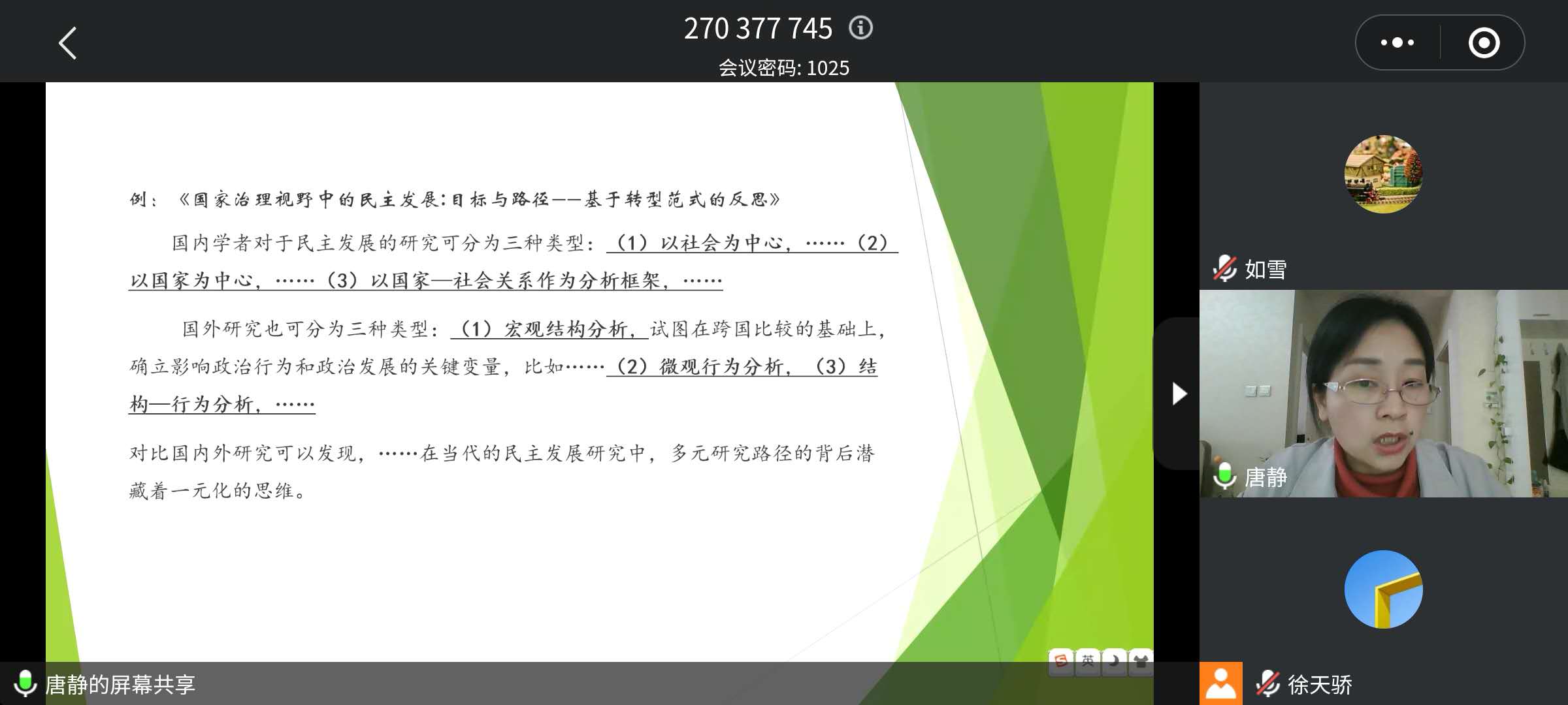 讲座末尾,唐静编辑和同学们围绕论文的写作与投稿以及当前一些热点学术问题展开了热烈讨论。线上同学纷纷踊跃发言,唐静老师在认真听取了大家的问题之后,耐心地进行了全面而深入的解答。活动获得圆满成功。