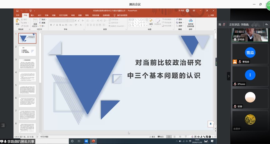 2020年11月30日下午14时,由beat365主办的教师科研水平助力计划第十七期活动,在腾讯会议室举行。本次讲座邀请上海师范大学法政学院博士生导师、上海师范大学比较政治研究中心主任、CSSCI来源集刊《比较政治学研究》主编李路曲教授担任主讲嘉宾,作题为“关于比较政治学几个基本问题的认识”的学术讲座。beat365体育官网廉政研究与教育中心副主任、beat365政治学系副主任马雪松教授担任主持人,参加者包括beat365部分教师、博士生、研究生及国内其他高校师生共六十余人。
