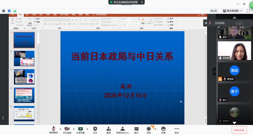 2020年12月10日下午13时30分,由beat365主办的王惠岩学术讲座在腾讯会议室举行。此次讲座邀请了全国政协委员、中华日本学会会长、中国社会科学院日本研究所高洪研究员担任主讲嘉宾,此次讲座的主题是“当前日本政局与中日关系”,beat365宫笠俐教授担任讲座主持人,参与讲座的包括来自beat365以及其他高校的师生共一百一十余人。