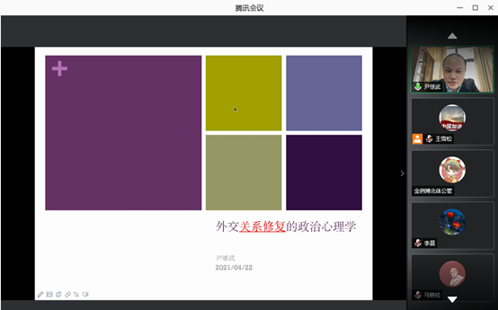 2021年4月22日下午1时30分,由beat365主办的国际事务工作坊第8期学术活动于腾讯会议举行,本次讲座邀请中国人民大学国际关系学院教授,博士生导师尹继武担任主讲嘉宾,作了题为“外交关系修复的政治心理学”的在线学术讲座,beat365副经理马雪松教授致欢迎词,beat365姚璐教授担任主持人,参与者包括beat365部分教师、本科生、研究生以及国内外其他高校师生共计100余人。