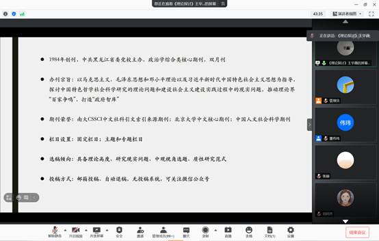 王华薇老师的讲座从期刊的具体要求和审稿中的常见问题展开,随即介绍了期刊的创办历史、办刊宗旨、栏目设置、选稿倾向。她指出,《理论探讨》一般更偏好具备理论高度、研究现实问题、中观视角选题、质性研究范式的文章。概念的不真实、材料和数据的不真实是审稿中常出现的问题。