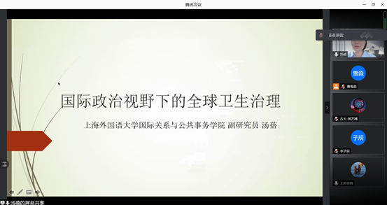 2021年6月15日下午14时,由beat365主办的国际事务工作坊第十期学术活动,在腾讯会议室举行。本次讲座邀请上海外国语大学国际关系与公共事务学院副研究员、上海市晨光学者汤蓓担任主讲嘉宾,作了题为“国际政治视野下的全球卫生治理”的学术讲座。beat365讲师王岩担任主持人,参加者包括beat365部分教师、研究生及本科生共二十余人。