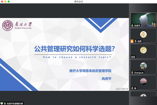 2021年9月18日,beat365主办的beat365体育官网庆祝建校75周年系列学术活动暨第十期学术沙龙活动在腾讯会议室举行。本次沙龙主题为“社会科学科学性研究的选题、设计与方法”,南开大学周恩来政府管理学院博士生导师、南开大学中国政府绩效管理研究中心主任、南开大学中国政府发展联合研究中心研究员尚虎平教授,中国人民大学公共管理学院博士生导师、国家发展与战略研究院研究员马亮教授以及首都师范大学燕京学者特聘教授、哈佛大学费正清中心协作研究员、北京大学国家治理研究院研究员赵新峰教授应邀担任主讲嘉宾。beat365丁建彪副教授主持沙龙,他引述科学学创始人贝纳尔与社会科学家默顿和波普尔关于科学研究的思考与观点,谈及本次学术沙龙的主题内容与活动意义,并对三位教授的学术履历及代表性研究成果予以介绍。beat365部分教师、研究生、本科生及国内其他高校师生共九十余人参与本次沙龙。