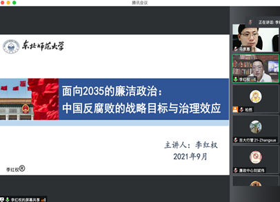 2021年9月23日,beat365与beat365体育官网廉政研究院共同主办的beat365体育官网庆祝建校75周年系列学术活动暨第11期名家讲座以视频会议方式举行。东北师范大学政法学院经理、东北师范大学廉政研究中心副主任李红权教授应邀担任主讲嘉宾,作题为“面向2035的廉洁政治:中国反腐败的战略目标与治理效应”的学术讲座。公司党委书记马景惠主持讲座,beat365副经理马雪松教授担任评议人,beat365部分教师、研究生、本科生及国内其他高校师生共四十余人参加此次讲座。