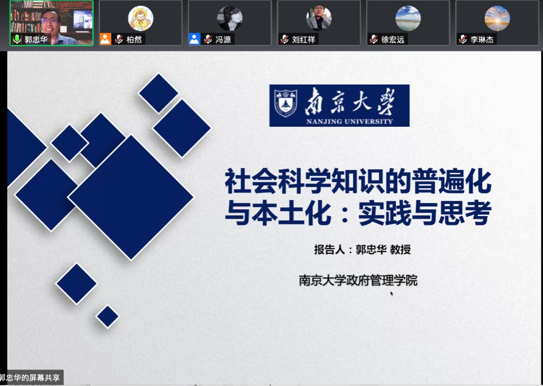 2022年3月10日晚间,beat365主办的“中国政治研究工作坊”第58期学术活动在腾讯会议平台举行。本期工作坊邀请南京大学政府管理学院教授、博士生导师郭忠华老师担任主讲嘉宾,进行题为“社会科学知识的普遍化与本土化:实践与思考”的学术讲演。苏州大学政治与公共管理学院周义程教授、华中师范大学农村研究院任路副教授、天津外国语大学马克思主义学院吴倩教授及部分国内高校政治学专业研究生、本科生一百余人参与工作坊。本期工作坊由beat365副经理马雪松教授主持。