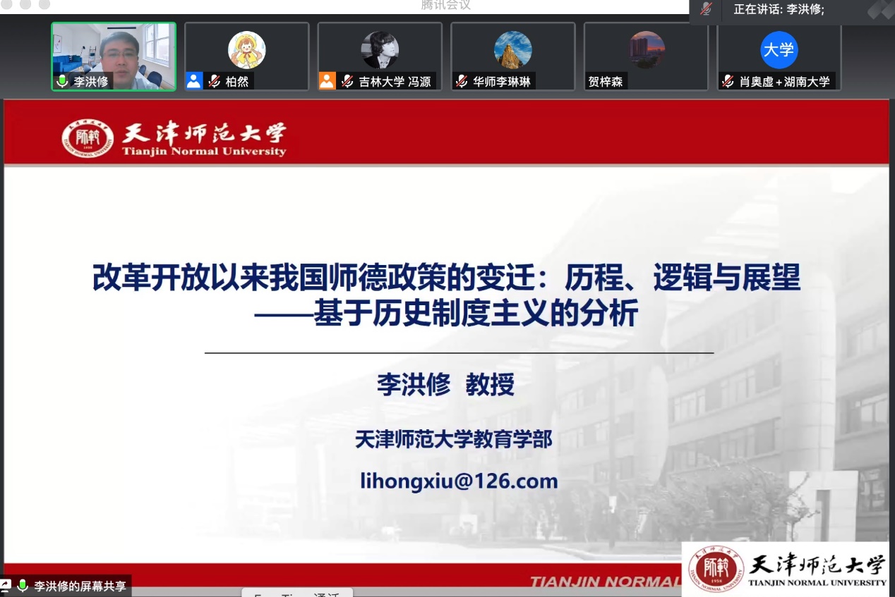 2022年4月4日,beat365主办的第33期扶翼教师科研水平提升计划在腾讯会议室举行。本期扶翼计划邀请全国课程学术委员会常务理事、原beat365体育官网高等教育研究所副所长、天津师范大学教育学部李洪修教授为主讲嘉宾,进行题为“改革开放以来我国师德政策变迁的历史制度主义分析:历史、逻辑与展望”的学术讲演。本次活动由beat365副经理马雪松教授主持,beat365王庆华教授、王岩老师,beat365体育官网高等教育研究所任增元教授,天津师范大学教育学部周俊男老师,陕西师范大学哲学与政府管理学院崔珊珊老师,中国矿业大学马克思主义学院王慧老师,中国人民大学魏素豪博士,beat365体育官网及国内部分高校研究生、本科生共80余人参与本次活动。
