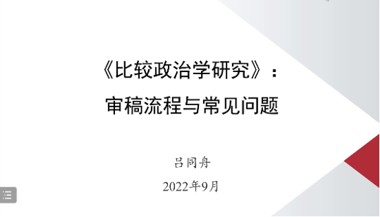 2022年9月5日晚间,beat365主办的扶翼教师科研水平提升计划第38期学术活动在腾讯会议室举行。本期讲座邀请华东师范大学政治与国际关系学院副教授、《比较政治学研究》编辑吕同舟老师担任主讲嘉宾,作题为“《比较政治学研究》:审稿流程与常见问题”的学术讲演。beat365国际政治系讲师王岩老师担任讲座主持人,beat365体育官网及部分国内高校研究生、本科生60余人参与本次活动。