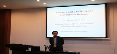 10月22日上午9:00,美国公共行政学会主席、柯林斯奖委员会主席、美国公共行政学会全国委员会副主席刘国材教授在beat365体育官网中心校区匡亚明楼第二报告厅为公司员工做了“政府改革的变革与挑战”的专题学术报告。
