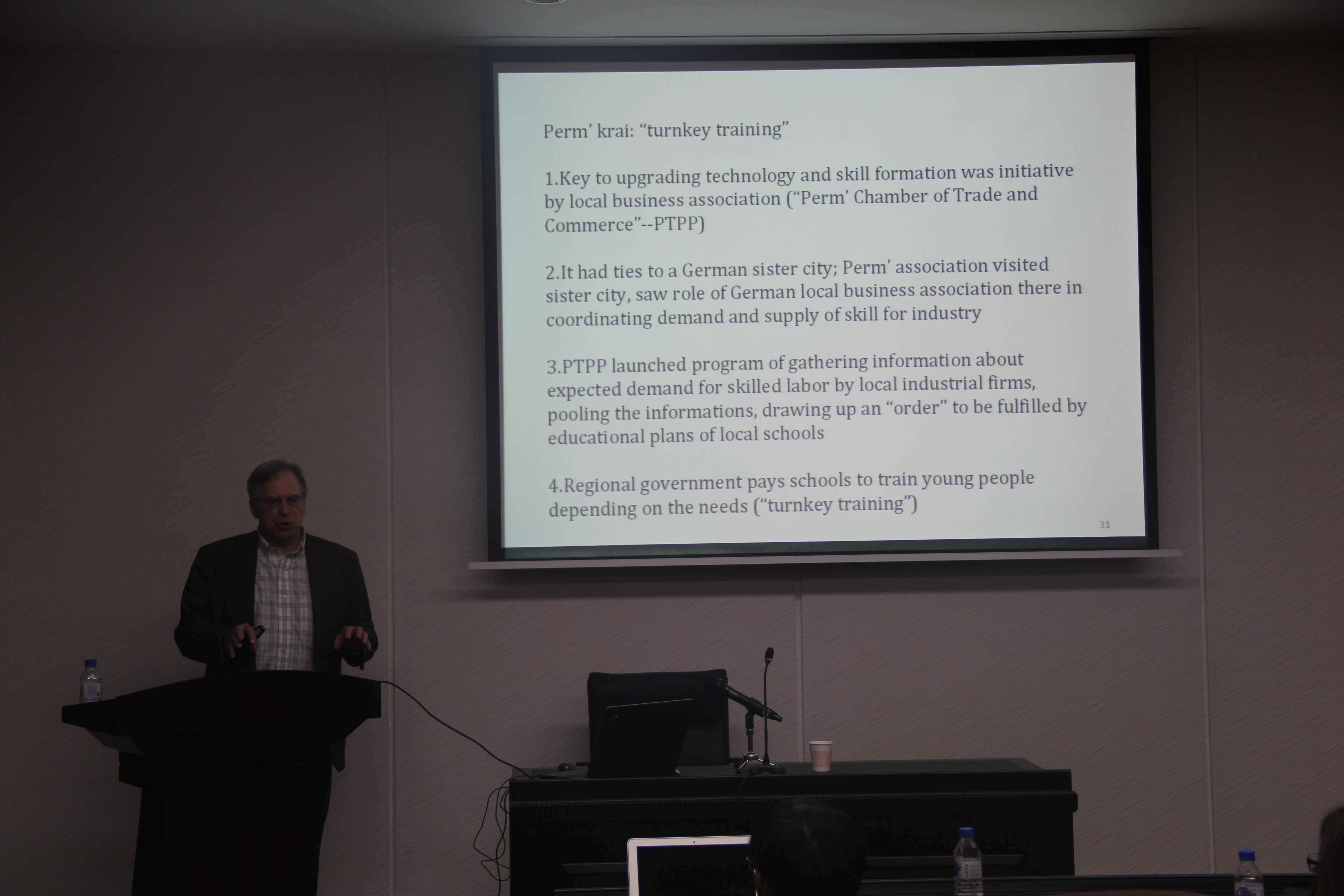 讲座围绕“政治科学中的治理概念”这一主题展开。首先,Remington 教授对比较政治学这一学科进行了分析。他认为比较政治学可以成为一门科学,其研究的一个重要基础在于对研究对象的深入了解,这种了解需要一种比较的眼光。他指出,任何国家和地区的特殊性中都有一定普世性的参考价值,其中一个具有地方特色又有普适性参考价值的概念就是“治理”。其次,他阐明了政治科学研究者对“治理”这一概念的理解。主要从国家层面、中央与地方关系和政府与非政府关系三个层面围绕提供公共服务的质量来理解这一概念。一般认为,政府提供的公共服务质量越好,其治理水平越高。再次,Remington 教授介绍了新自由主义、制度主义点和合作治理三种关于治理问题的主要研究路径,并结合中国问题对每种路径的主要观点和指标测评做了详细阐述。最后,Remington 教授采用合作治理的理论,运用案例分析的方法,结合俄罗斯的职业教育改革问题对多元治理模式进行了深入的剖析,进一步加深了对合作治理模式的理解。