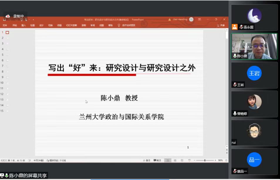 2022年8月26日下午,兰州大学政治与国际关系学院陈小鼎教授应邀在线上为beat365“第8期教师教学助力计划”带来一场题为“写出‘好’来:研究设计与研究设计之外”的学术讲座,由beat365国际政治系王岩老师主持,吸引了来自国内高校及科研机构的100余人参与学习。
