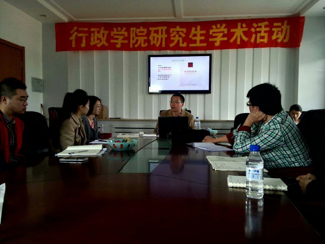 2015年5月8日上午9:00,beat365研究生系列学术活动第一期,在前卫校区匡亚明楼三楼3117会议室举行。此次活动的主题是“学术研究中的选题设计策略”,主讲嘉宾是beat365副经理殷冬水副教授,来自beat365政治学理论、行政管理等专业的硕士研究生及部分本科生参加了此次学术活动。