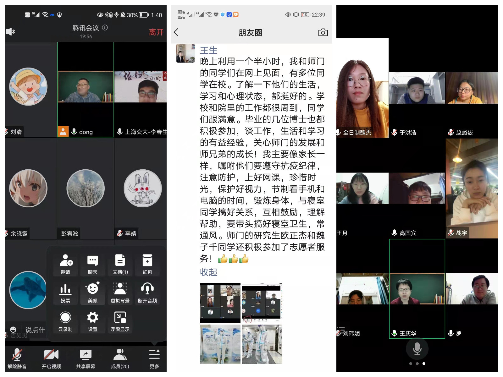 员工指导方面,受市区和校园的疫情防控政策影响,导师们无法同此前一样与同学们固定时间、固定地点召开组会,如何及时了解同学们的思想动态与学业进展,成为了疫情管控期间的一大挑战。部分导师在校园封闭管理后,第一时间通过线上组会方式与同学们面对面交流,及时关怀毕业年级同学的论文修改情况,对承担志愿工作的志愿者同学们进行慰问,关心同学们在寝室封闭管理中的心理状态,同时也就当前科研团队各项任务的工作进展、理论学习等进行指导与解答。