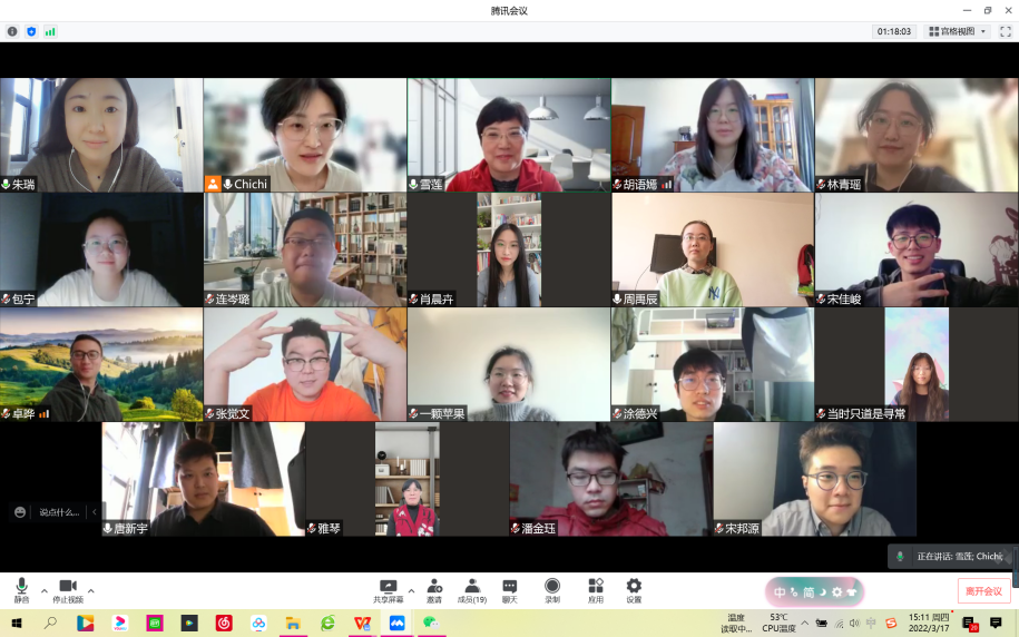 3月17日,刘雪莲老师带领18名员工开展线上讨论。刘老师首先对同学们的生活和身心健康表达了关心,叮嘱大家要好好防护,保持乐观心态。在接下来的讨论中,各位同学针对本学期的学习计划进行汇报,每一位同学展露出良好的精神状态以及积极的学习态度,令老师十分动容。最后,刘老师动情说到,“特殊时期,你们都能乐观面对,懂得感恩,并且积极向上,努力学习,你们都是老师的骄傲!期待春天到来时,我们可以在线下有更好的相遇!”
