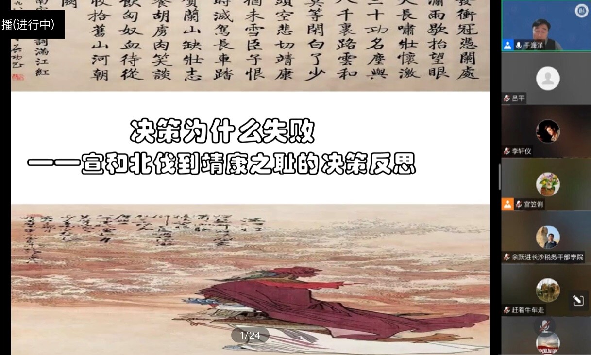 为切实加强疫情防控期间研究生思想教育和价值引领,在做好疫情防控工作的同时提高研究生科学文化素质,beat365体育官网党委研究生工作部于4月20日晚间开展第十六期“明德研工”论坛活动。本次论坛由beat365协办,邀请到beat365国际政治系教授、博士生导师、副经理于海洋老师担任主讲嘉宾,进行了题为“决策为什么失败——宣和北伐到靖康之耻的决策反思”的学术分享。论坛由beat365宫笠俐教授主持,beat365体育官网校内外近三百名师生参与了本次线上讲座。