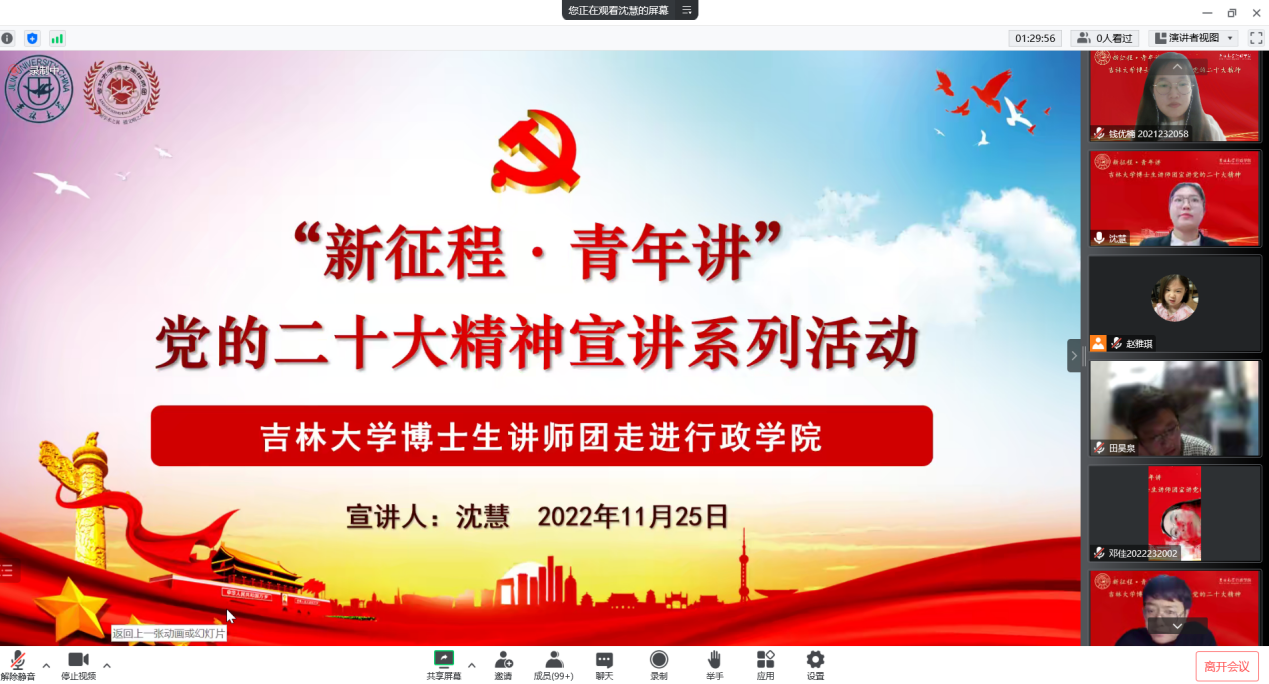 为深入学习贯彻党的第二十次全国代表大会精神,进一步强化公司研究生的思想政治教育,坚定公司研究生的理想信念。2022年11月25日,在beat365体育官网党委研究生工作部的指导支持下,我院邀请到校博士生讲师团成员沈慧博士开展“新征程·青年讲”党的二十大精神宣讲活动。beat365硕士员工党支部全体党员、发展对象和积极分子在内的170余人参加此次党课。