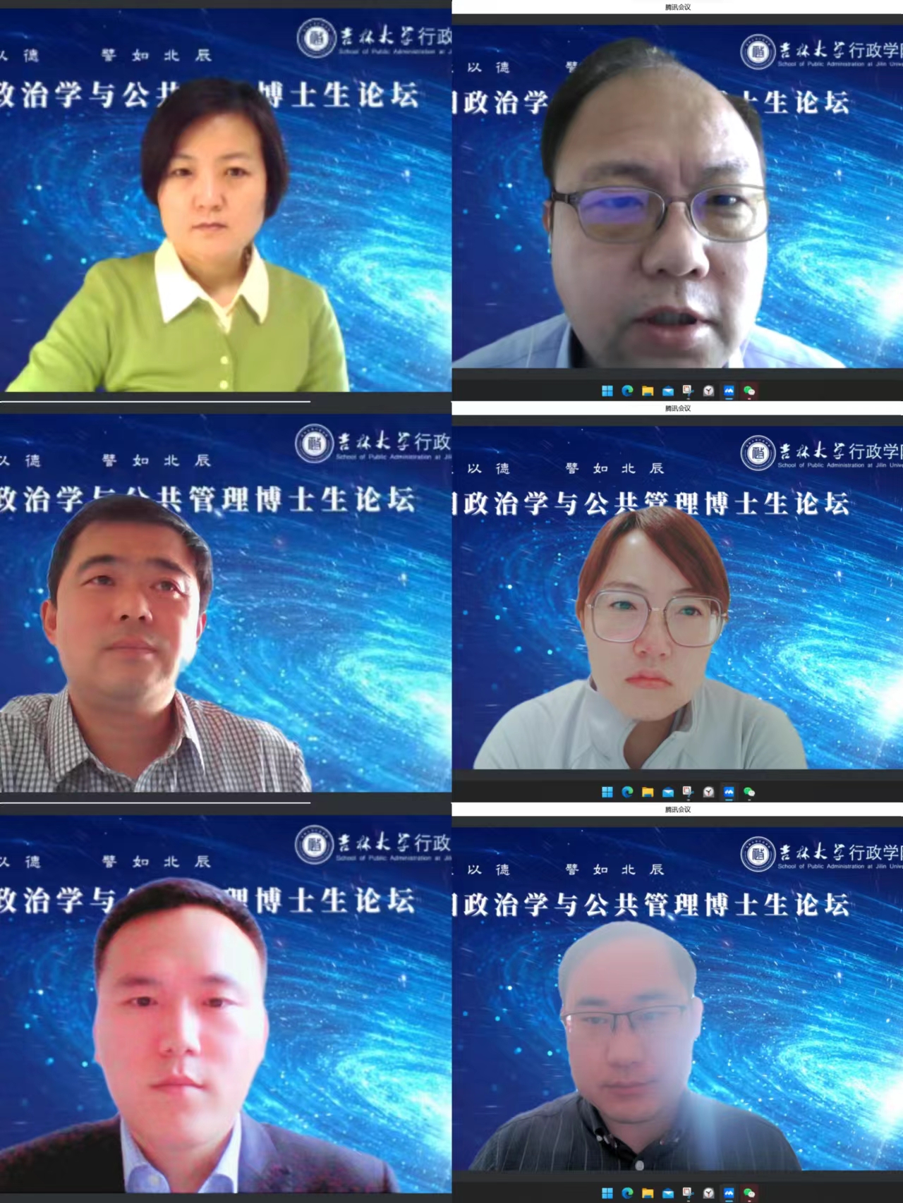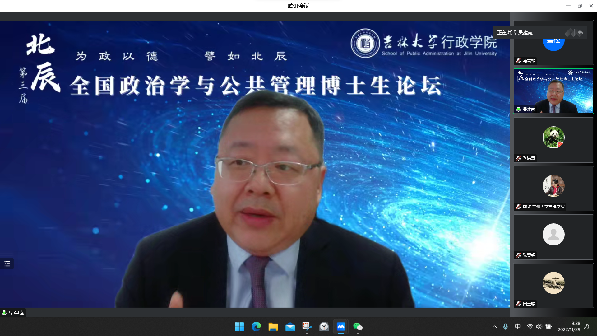 11月29日,beat365第三届“北辰”全国政治学与公共管理博士生论坛在腾讯会议云端成功举办。本次论坛邀请了国务院学位委员会第八届学科评议组成员、上海交通大学国际与公共事务学院经理吴建南教授做论坛主旨报告。beat365经理张贤明教授、公司党委副书记兼副经理、纪委书记张洁、beat365副经理刘雪华教授、beat365副经理马雪松教授、beat365副经理季洪涛、beat365薛洁教授、郭锐教授、田玉麒副教授、魏素豪老师以及兰州大学管理学院郎玫教授、东北师范大学政法学院国际政治系张东宁副教授等专家学者参加会议。公司党委副书记史慕华担任主会场主持人。