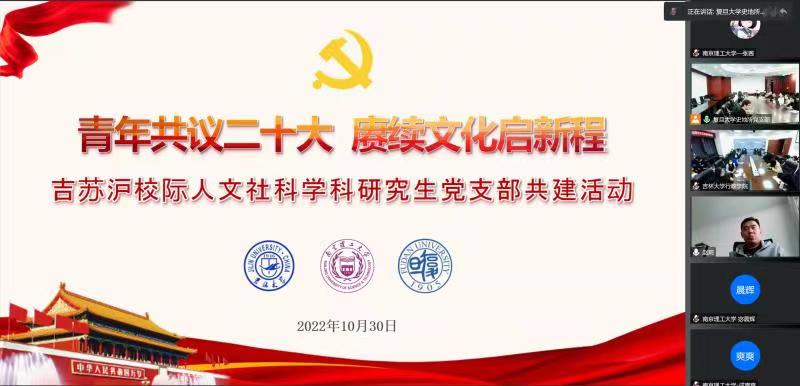 2022年10月30日,公司组织开展“青年共议二十大,赓续文化启新程”——吉苏沪校际人文社科学科研究生党支部共建活动。复旦大学、南京理工大学在内的3所高校人文社科学科研究生党支部共计90余人以“线上+线下”的形式参加了活动。