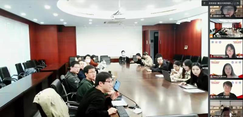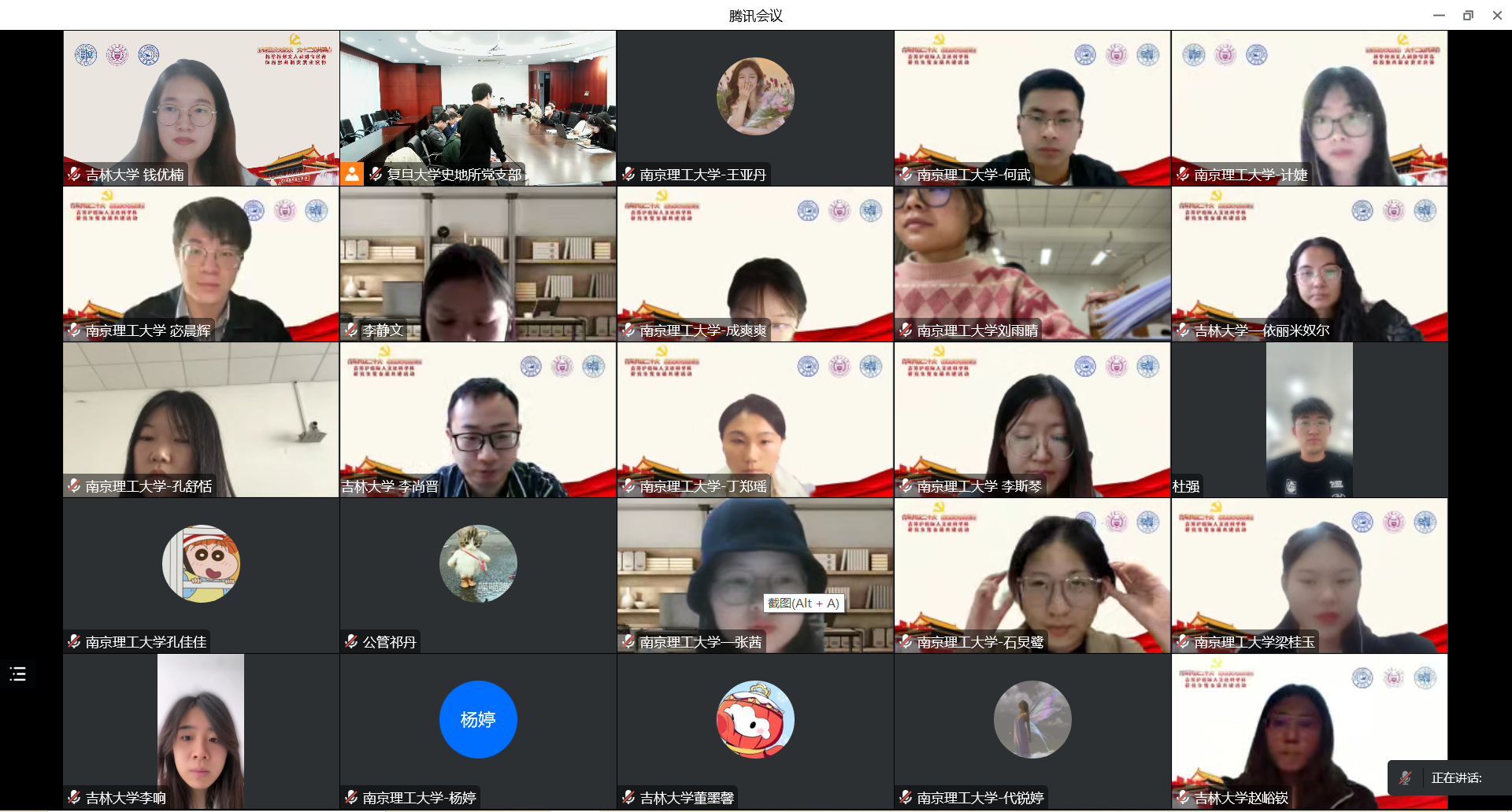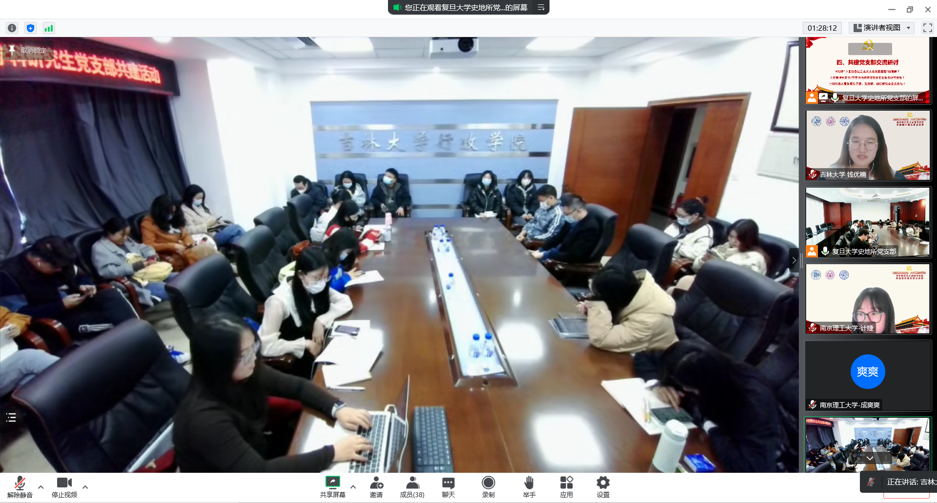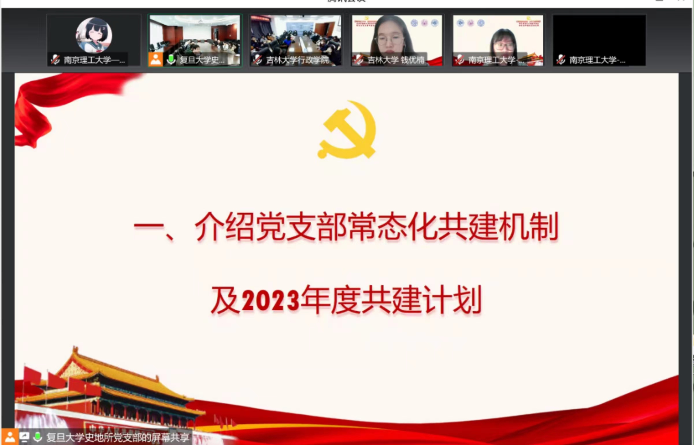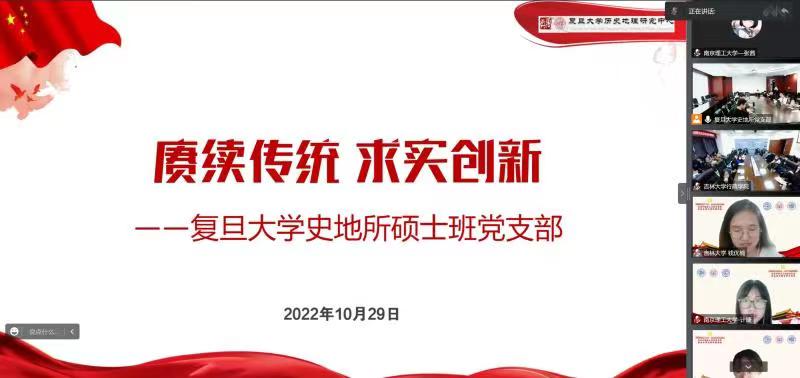 复旦大学史地所硕士班党支部书记盛灏成和南京理工大学公务学院公共管理硕士党支部书记计婕也分别围绕史地所对文化的传承、“中华民族共同体意识培育的新样板”进行了介绍。南京理工大学发展规划处副处长赵珂对本次共建活动作出亲切交流。