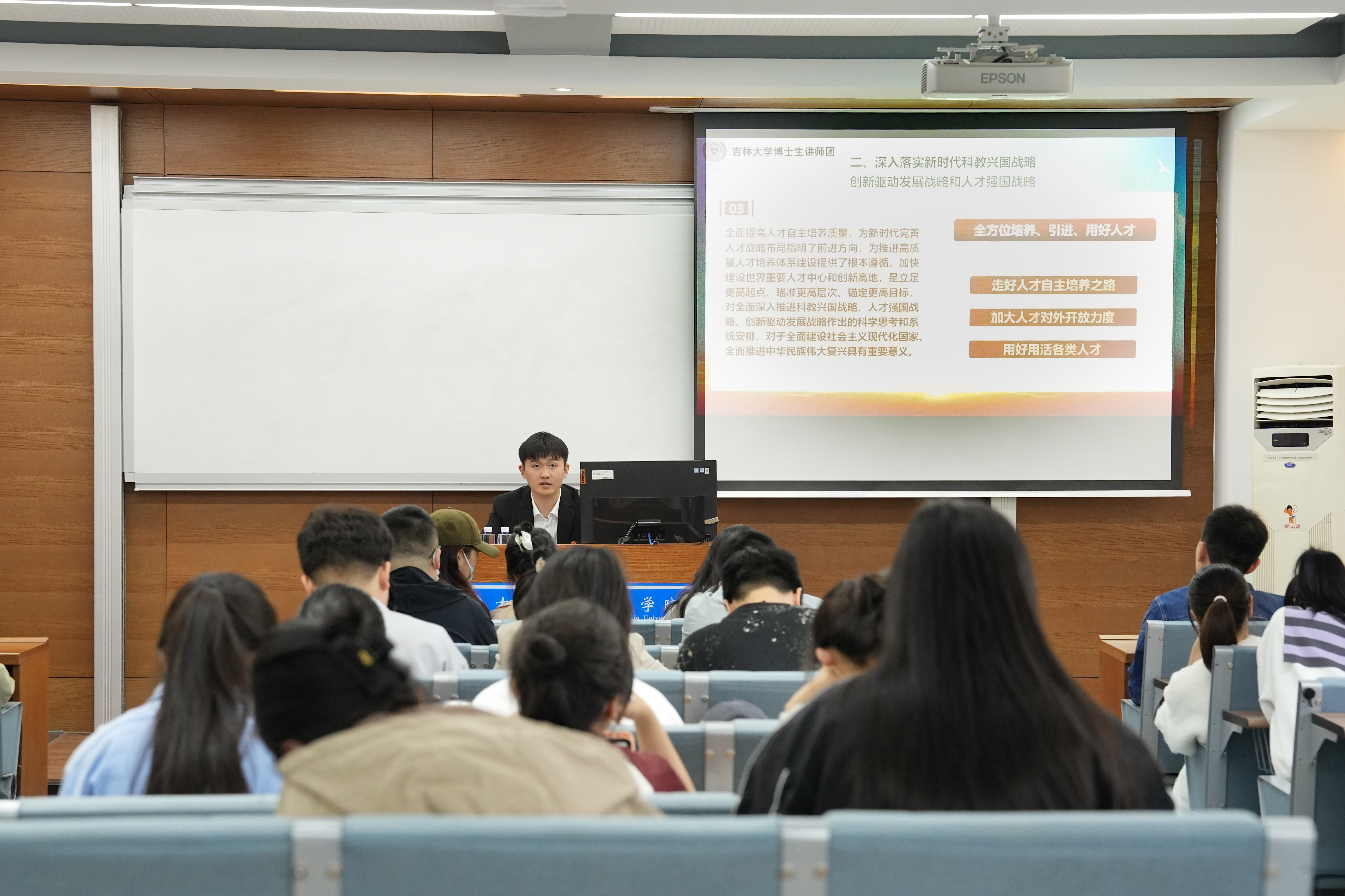 为深入学习贯彻全国两会精神,充分发挥博士生讲师团理论宣讲作用,2024年5月16日,beat365体育官网博士生讲师团讲师王嘉玮走进公司开展“学习贯彻两会精神 聚力中国式现代化”宣讲系列活动。本次宣讲的题目是“坚持教育科技人才强国建设一体化推进,注入新质生产力发展澎湃动能”。beat365部分研究生参加了本次活动。