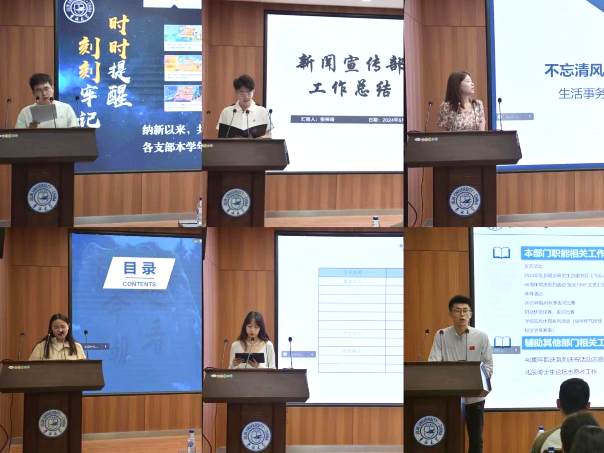 会议伊始,团学组织各部门负责人依次进行工作总结汇报。组织建设部负责人金浩楠从部门日常工作、部门特色工作、部门重大工作以及院院联动工作四个部分展开汇报。新闻宣传部负责人张梓琦从本职工作完成情况、部门成员参与团学工作情况、新闻宣传部未来发展三个方面总结工作内容。生活事务部负责人王思源围绕求职创业补贴材料审核、研究生寝室安全检查、标兵宿舍评比等工作对部门工作任务进行了总结。发展指导部负责人冯思嘉详细介绍了部门所开展的暑期实习实践分享会、往届生就业经验分享、组织实习实训讲座等活动。学术文化部负责人于默暄从集体合作、学术活动、材料撰写、日常工作、线上工作五个方面梳理过去一学年的工作成效。文艺体育部负责人张景国对学院迎新晚会、学校“院系杯”、“研冠杯”、“导学杯”等文体活动进行回顾。