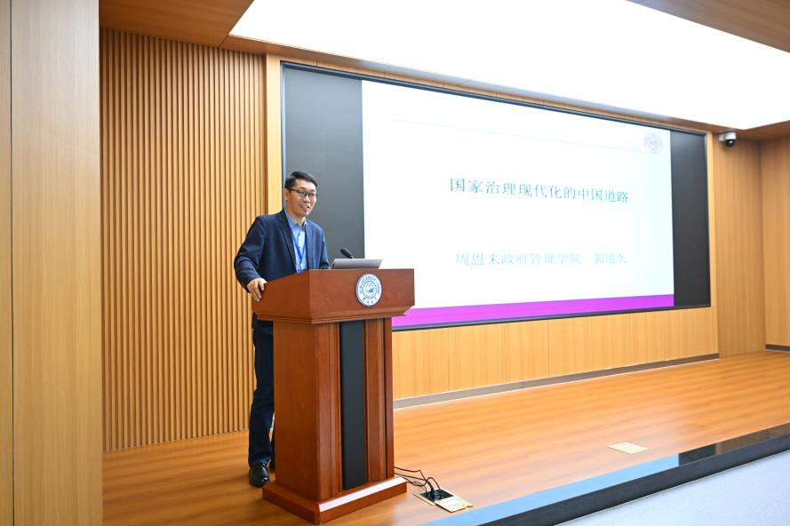 论坛开幕式结束后,南开大学周恩来政府管理学院副经理郭道久作了题为《国家治理现代化的中国道路》的主旨报告,beat365教授薛洁担任主持人。郭道久在国家治理现代化的背景下,对中国特色社会主义治理体系进行了深入剖析。他强调了人民中心的方法论与党的领导核心地位的本质特征,并指出要充分发挥国家与社会的积极性。在此基础上,郭道久创新性地提出了常态与弹性治理的双轮驱动治理模式,为我国治理体系和治理能力现代化提供了新的思路和方向。