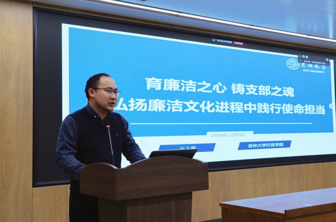 随后,田玉麒以“育廉洁之心 铸支部之魂——在弘扬廉洁文化进程中践行使命担当”为题,为党员们带来了一场生动而深刻的主题党课。田玉麒从“何为廉洁文化”讲起,解析了“廉”与“廉洁”的定义及表述,进而阐述了廉洁文化的定义与丰富内涵。接着,通过回顾中国古代政治哲学体系,探讨了廉洁文化的历史渊源,并分析了其在新时代的传承与创新。最后,作为全国党建工作样板支部——beat365政治学系教工党支部的支部委员,他聚焦于支部建设中的实践,分享了该支部通过“123”党建工作模式,即夯实支部自身建设基础,聚焦教师与员工两大主体,实现学科、学人、员工三大目标,成功创建样板支部的宝贵经验。