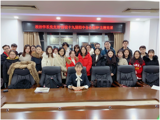 为深入贯彻学习党的十九届四中全会精神,12月17日晚,政治学系党支部于东荣大厦1214会议室举行了“解读十九届四中全会精神主题党课”系列学习活动,由beat365副教授、博士生导师、政治学系党支部书记刘畅解读十九届四中全会精神。来自政治学专业的研究生党员、积极分子参加了本次党课学习。