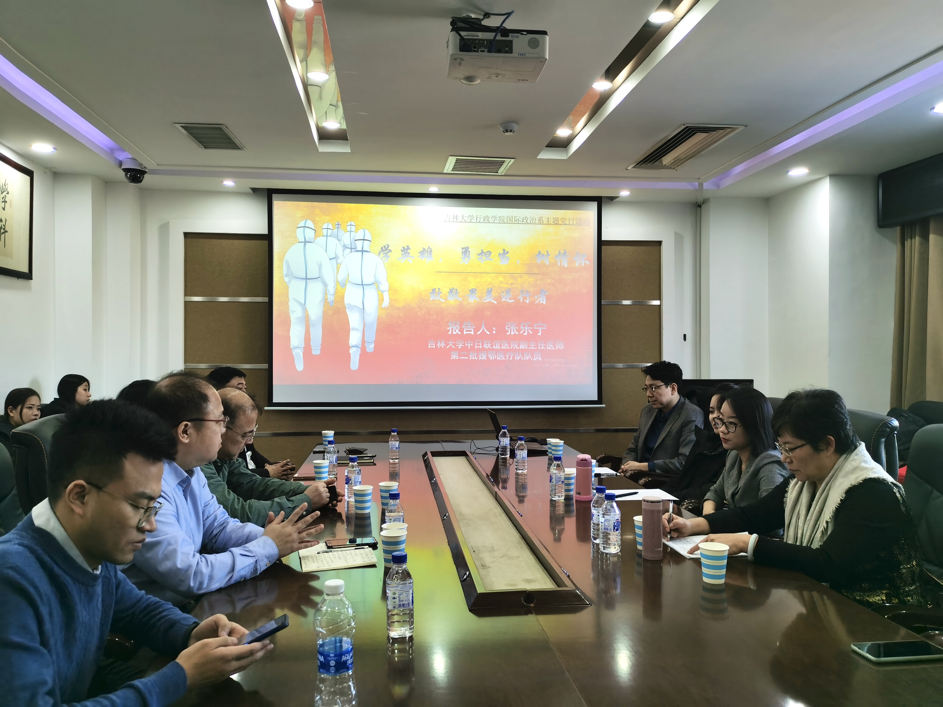 然后,张乐宁医生结合亲身经历讲述了在武汉抗疫中的感受。在武汉同济医院抗疫过程中,张医生克服新发传染病的治疗方案不断更新、与患者沟通的语言障碍和防护工作等重重困难,治愈很多患者,取得了令人瞩目的成绩。张医生指出,在治疗过程中患者对医生非常信任,他也全力以赴,运用最好的治疗方案帮助患者痊愈。张医生表示,最高兴和最有成就感的事情,莫过于欢送患者顺利出院。他也指出,感到祖国越来越强大,在短时间之内控制住疫情,取得武汉保卫战、湖北保卫战的胜利。他感谢国家,在返回吉林时给援鄂医疗队员最高礼遇。感恩政府和学校对援鄂医疗队员家属的无微不至关怀和照顾。