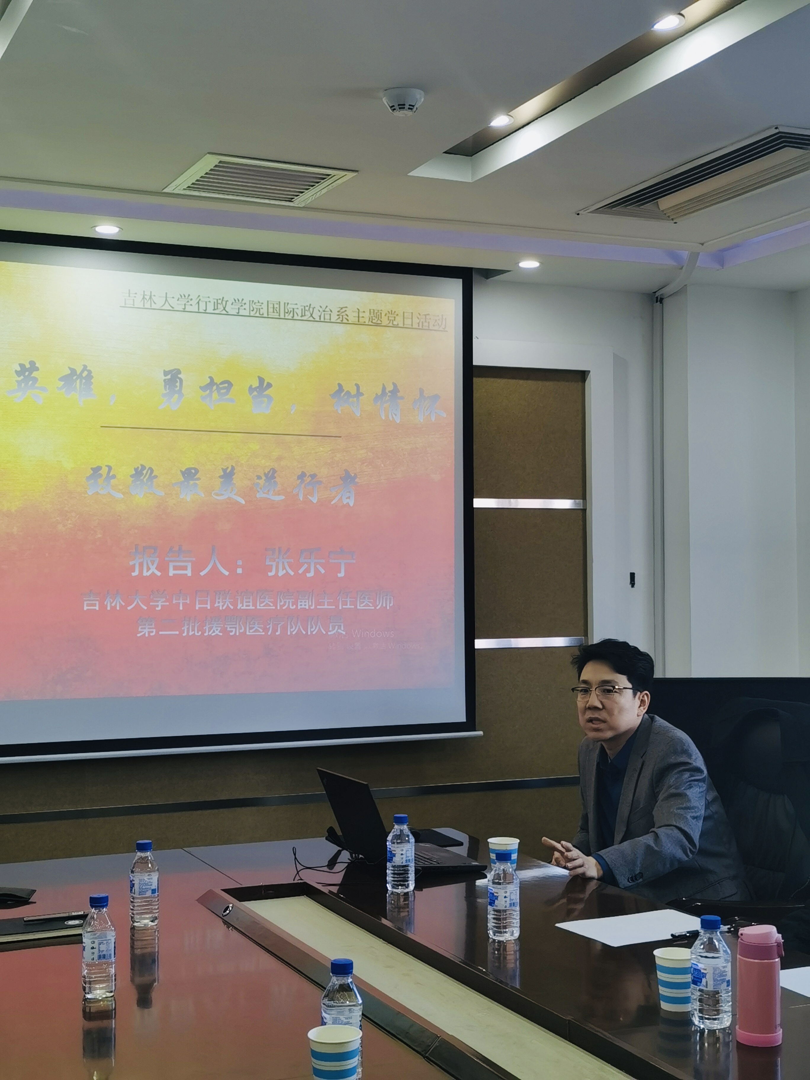 为弘扬伟大抗疫精神,激励各位党员同志的责任感和家国情怀,2020年12月16日,国际政治教工党支部在东荣大厦1214会议室举办了以“学英雄,勇担当,树情怀——致敬最美逆行者”为主题的专题党课。支部特意邀请到吉林省第二批援鄂医疗队队员、beat365体育官网中日联谊医院副主任医师张乐宁讲授党课。beat365国际政治学教工党支部、研究生党支部近20名党员参加了本次党课学习,国际政治学系党支部书记姚璐主持活动。