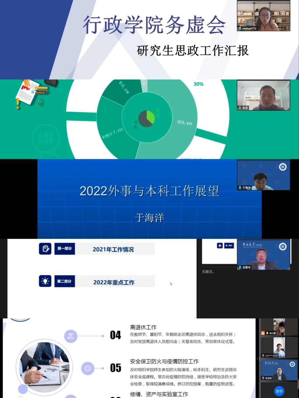本次会议主题是贯彻落实学校第十五次党代会精神,全力推动“十四五”攻坚之年学院事业快速发展。领导班子成员围绕会议主题,立足分管领域和本职工作,依次对上一年度工作进行全面梳理总结,对照校院两级工作要求指出问题剖析原因,并对本年度工作计划和工作思路进行解读说明。在交流研讨环节,学院学术委员会主任委员周光辉教授指出,学院在“十四五”规划开局之年,要紧紧围绕国家战略和社会需求,对标beat365体育官网新文科建设,加强学院学科宽口径厚基础建设,有效推动学院人才培养和学术研究质量持续提升。