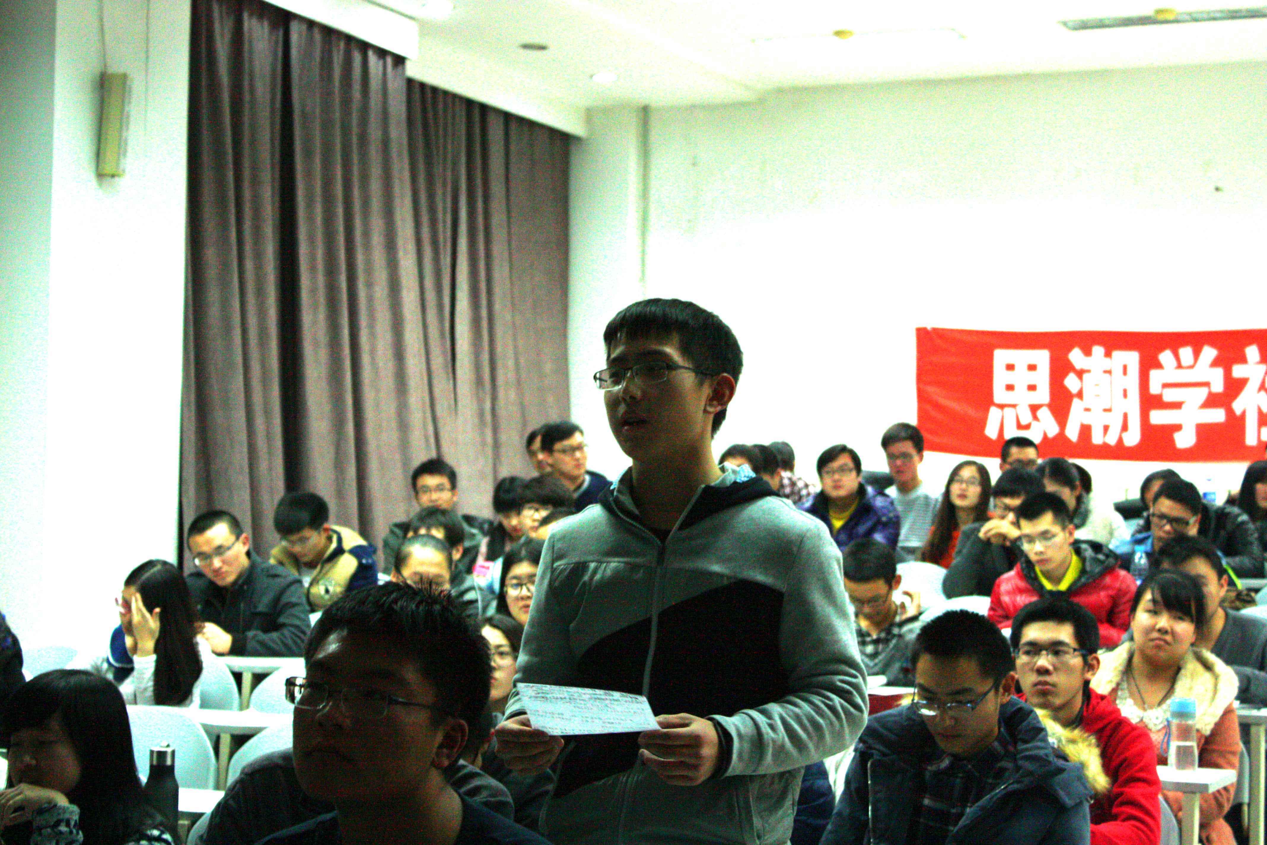 讲座过程中,于海洋从怎么读书和读书的意义两个方面给大家分享了自己的经验与感受,他结合当下社会背景、大学状况、员工状态给大家提出了关于读书方法的建议,他认为在这个微阅读盛行的时代大家应该多进行深阅读,应该通过反思和批判来提高自己,拒绝被愚弄,做一个智慧的人。在读书意义方面,于海洋结合国际政治相关案例和自己的经历谈了读书的意义。他认为读书能让你丰富基础知识、提高判断和拣选能力,在批判中建立自己的知识体系、世界观甚至人生信仰,他期冀大家能在阅读中秉正道而行,能获得道德上的修炼提升。最后,于海洋还就碎片化阅读的利弊、电子书与纸质书的区别、读书应该追求意思还是意义等一些问题回答了现场听众的提问。于海洋对于读书的深刻认识和精彩讲解,幽默风趣而又发人深省,赢得了现场观众阵阵热烈的掌声。讲座结束后,思潮学社向参与本次讲座的前50名同学赠送了精美图书。