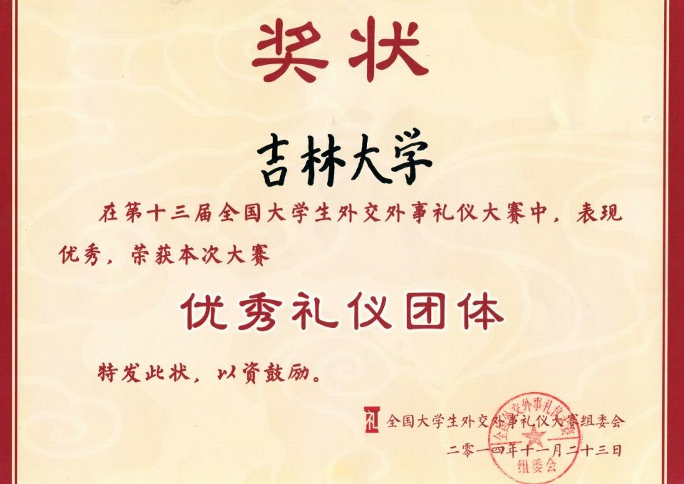 2014年11月23日,由中国外交学院主办的第十三届全国老员工外交外事礼仪大赛在外交学院大礼堂落下帷幕。2012级本科生李莎莎、范鸿仪、苏靖、夏海洋经过校内的层层选拔获得组成了beat365体育官网代表队,在beat365辅导员刘洋老师的带领下,奔赴北京参加国赛。