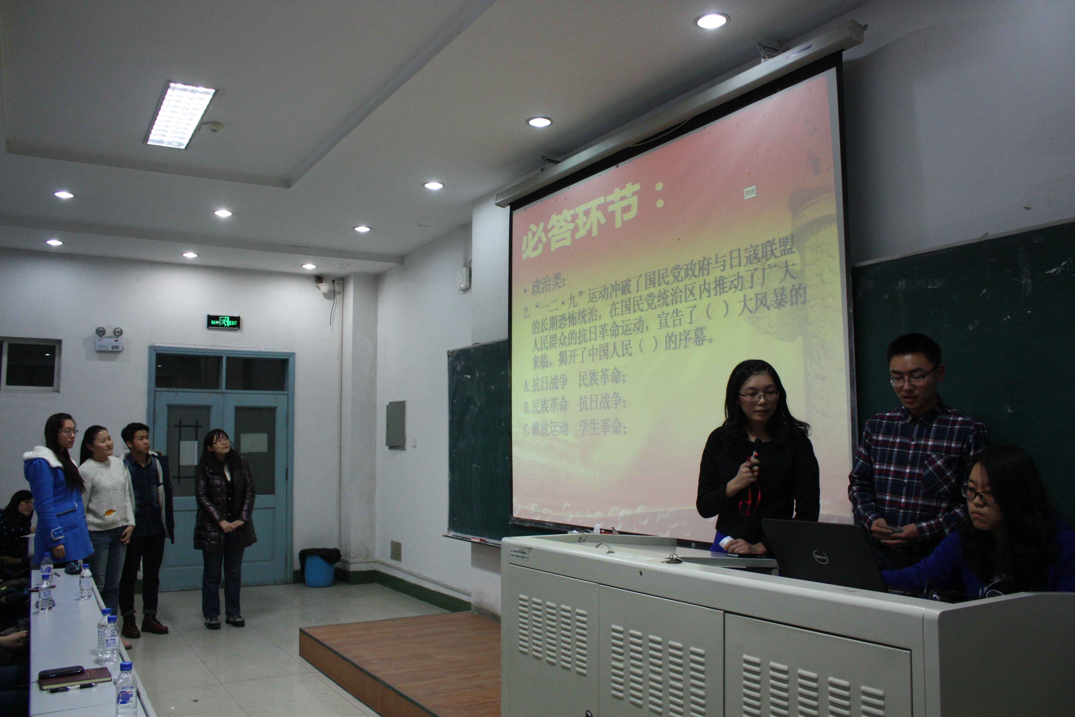 为铭记光荣历史,争做优秀团员。beat365纪念“12.9运动”团日活动第二场——“12.9”主题知识竞赛于12月7日晚6点在beat365体育官网前卫南校区三教三阶进行。本科生辅导员刘洋、曲畅竹,团委主要员工干部出席本次活动。本次活动由姜鹤(2013级)和王森(2014级)主持,参赛的五个队伍分别是2014级四个班级和社团代表队。