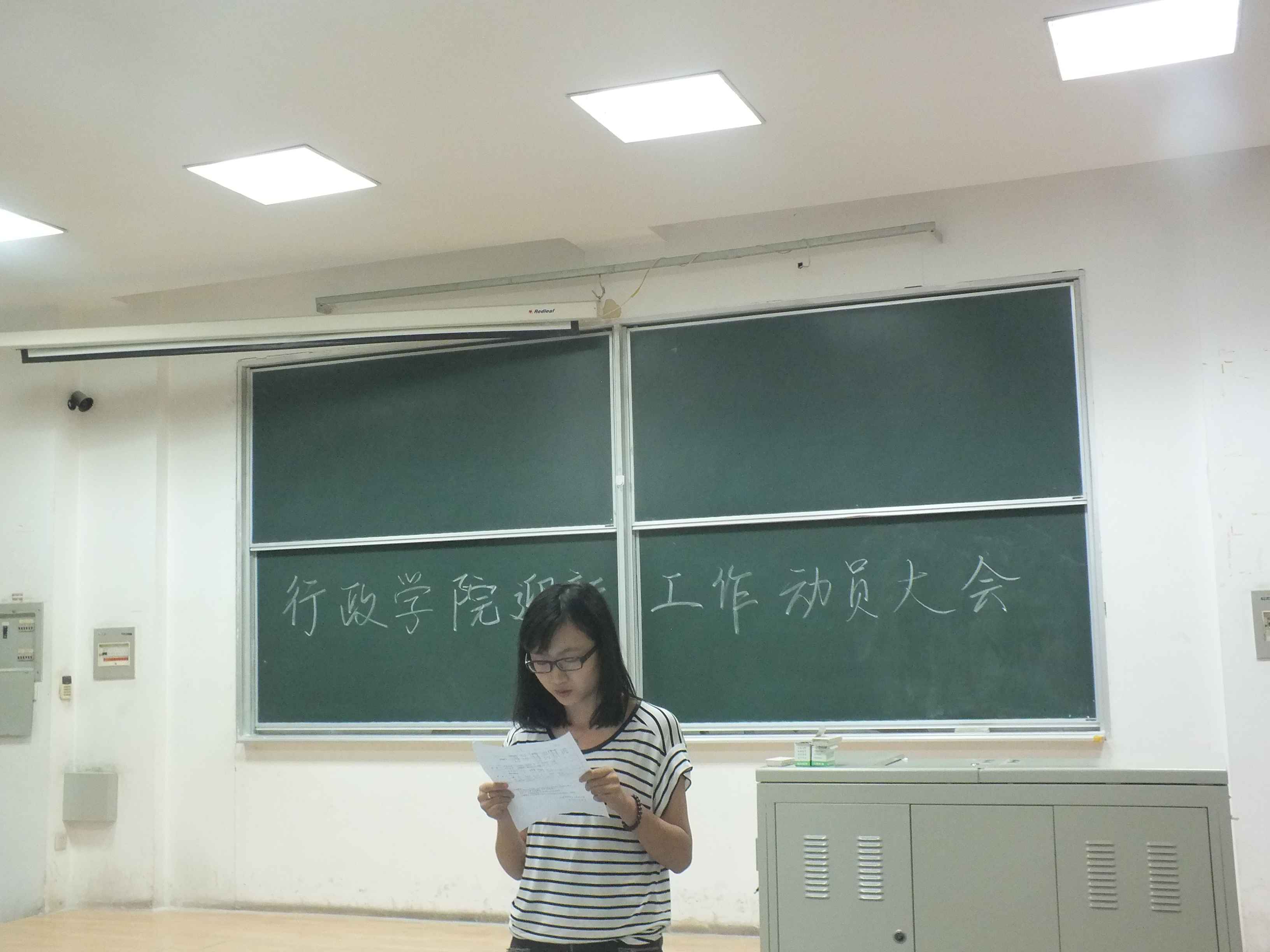 会上,刘洋以有着特殊意义的六组数字为切入点,向同学们提出了迎新工作的总体要求。他提到,大家首先作为学长学姐,身上就肩负着一份责任;同时又作为员工干部,在收获师长同学关心与支持的同时更应该秉承“服务他人、收获成长”的理念,详细了解自身的工作任务,全身心地投入到迎新工作之中。他强调,面对新生,员工干部作为骨干力量,应当展现出行政学子良好的精神风貌,向新生展示积极、正面的形象。最后,他指出,迎新是一项长期持续的工作,他期望同学们能承担起自身的责任,给予新生长期的帮助与引导。之后,曲畅竹介绍了迎新工作人员的职责分工,对其着装、言谈举止等各个方面提出了具体要求,鼓励同学们通力合作并预祝迎新工作取得圆满成功。会议的最后,由员工会秘书长李沁妤(2012级)宣读迎新工作安排。