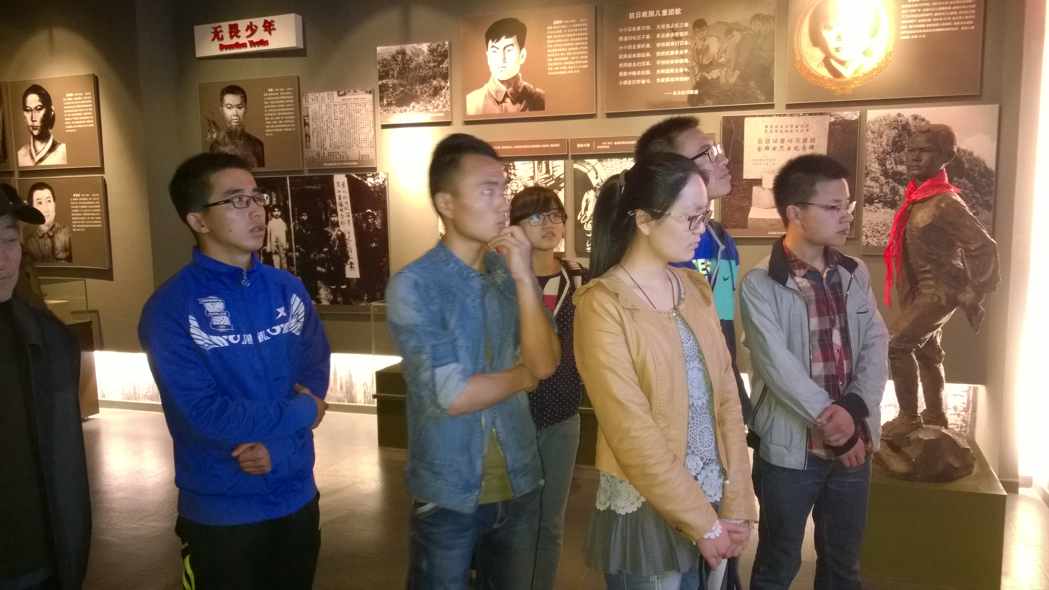 众所周知,1931年日本发动了九一八事变,自此东北地区沦落为殖民地。在当地的反抗斗争中涌现出一大批仁人志士,他们抛头颅洒热血,为了新中国的建立奉献出自己的生命。进入展馆内,同学们在讲解员的带领下来到位于三楼的“黑土英魂”展区。本展区共分为四个部分,讲述了从1931年东北沦陷到1945年抗日战争胜利的曲折历程。参观中,同学们随着讲解员的讲解认真地感受着来自60多年前的悲痛呼喊。仁人志士们为了心中坚定的理想和信念而拼搏着,杨靖宇,赵尚志,冷云,赵一曼,这些熟悉的名字在同学们的脑海中一幕幕地浮现。