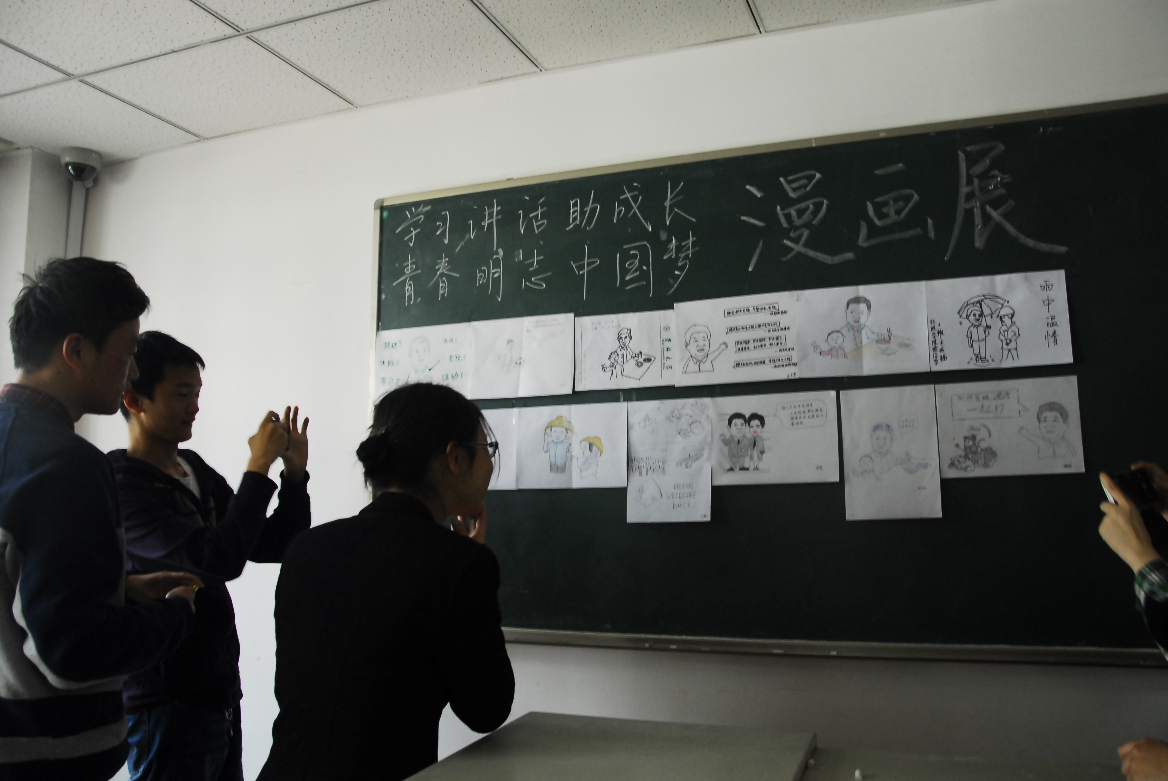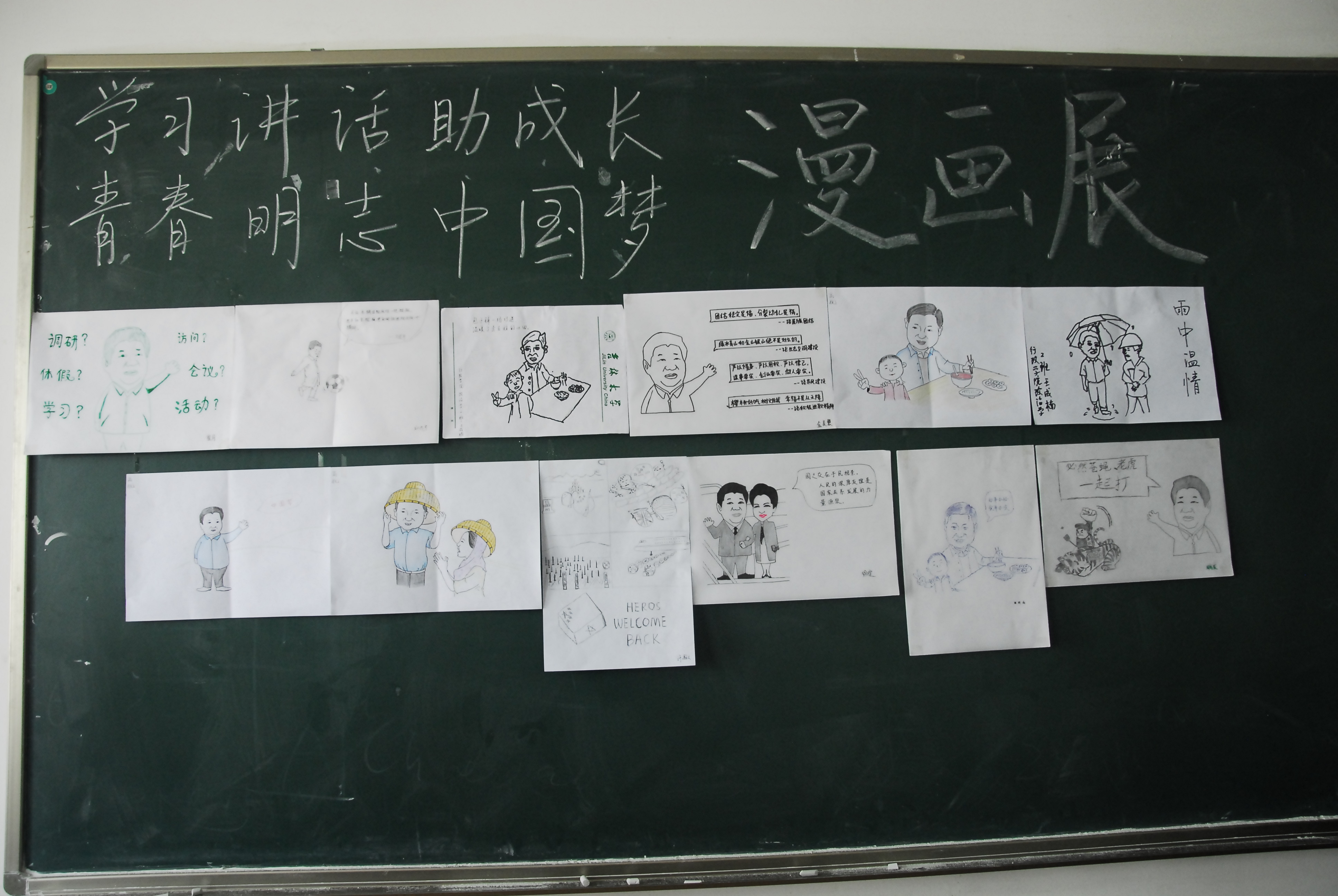 11时40分,活动正式开始,同学们按照顺序依次对自己已经创作好的漫画内容进行讲述。20多张漫画均为原创,内容丰富,中心思想深刻。既包括习近平总书记的肖像画,习近平总书记“时间都去哪儿了”的描述画,又包括习近平总书记在庆丰包子铺与民众合影,大雨之中在工地上与农民工交谈,在自治区与少数民族员工聊天等故事画。在活动中,同学们对漫画内容的讲述饱含深情,“庆丰包子铺的一次偶遇,温暖了老百姓的心”,“大雨之中,展现总书记温情”等话语充分体现了同学们对于总书记的爱戴之情。漫画展通过同学们喜闻乐见的方式,提高了同学们参与的积极性,并围绕着习近平总书记的亲民形象展开,深刻反映出一切为了群众、一切依靠群众和从群众中来、到群众中去的群众路线精神。在随后的座谈会中同学们交流了活动的感受和心得。