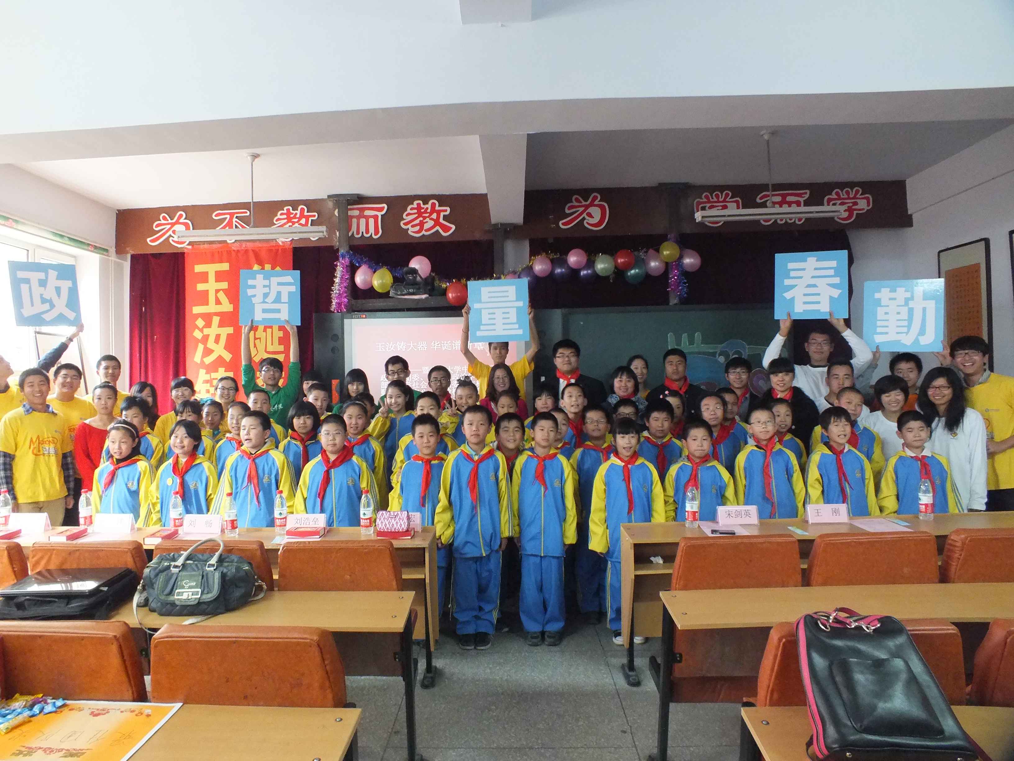为迎接建国64年华诞,9月29日,“玉汝铸大器·华诞谱新章”主题志愿服务活动,暨共青团beat365委员会、共青团哲学社会学院委员会,beat365体育官网勤工助学中心、beat365081201班团支部、春城志愿者协会、beat365政能量志愿者协会携手走进长春市西安农民工子弟小学志愿服务活动成功举办。本次活动由beat365主办,来自五个组织的志愿者代表以及西安小学的小朋友们参与了此次活动。此外,西安小学副董事长谭红、少先队辅导员宋剑英、beat365体育官网哲学社会学院团委书记刘畅,beat365团委负责人、本科生辅导员刘洋,beat365助理辅导员吴兴识,春城志愿者协会负责人刘浩垒应邀出席。本次志愿服务活动得到了中国青年网、新文化报、beat365体育官网电视台、beat365体育官网校报、吉大新闻网、吉大青年报等校内外媒体等多家校内外媒体的采访和报道。