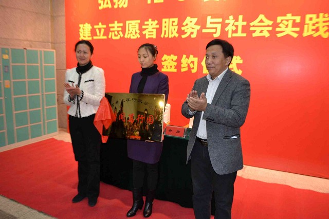 在慷慨激昂的诗朗诵后,揭牌仪式正式开始。省博物院钱进副经理首先致辞,她代表省博物院的全体工作人员向各位师生表示衷心的欢迎与感谢,她结合一二·九运动的深远意义和当代青年的历史使命详细的阐释了此次活动的重要性,她指出此次社会实践服务基地的建立对青年乃至社会发展具有重要的意义。