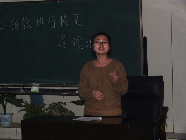 开篇立论阶段,正方从捐款排行榜的激励作用出发,具体论证了“捐款排行榜是道德示范”的命题。反方范子雁则从捐款行为目的复杂性,捐款排行榜以捐款额排名对捐款人造成的权利侵害和心理消极影响加以论证,进而对“捐款排行榜是道德强迫”的观点进行了精确的阐述。精彩激烈的攻辩与自由辩阶段,双方辩手旁征博引,反应灵敏、配合默契,充分展示了他们丰富的学识和敏捷的思维,双方智慧的较量与语言的交锋使现场高潮迭起,赢得了评委及在场观众的阵阵掌声。总结陈词阶段,双方辩手思维缜密,在指出对方逻辑错误与表述漏洞的基础上对本方观点进行升华,并进行了严密的论证,为比赛画上了圆满的句号。赛后,本场嘉宾、beat365辩论队优秀教练贾茹对比赛进行了精彩的点评。她对本次辩题给予了深刻的剖析,并充分肯定了双方的精彩表现,同时,她也客观指出了双方在辩论技巧和比赛准备等方面的不足并提出了自己的意见。最终,经过评委团评议,反方一辩范子雁获得本场比赛的最佳辩手。
