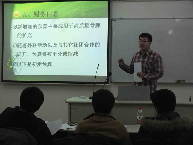 为贯彻落实校团委关于开展beat365体育官网2013年“每团一品”活动的工作要求,遴选出院内最具影响力的精品员工活动,全面总结员工社团2012年工作情况,12月3日晚6时,beat365团委社团部于中心校区逸夫教学楼MPA教室成功举办了2013年“每团一品”活动院内申报答辩会。beat365助理辅导员刘洋,团委副书记董华荣、金武泽,团委社团部部长张孟歌应邀出席并担任评委。社团部全体成员及beat365外语协会、ICU模拟联合国协会、海化社、思潮学社、同为社、农村发展研究会、政能量志愿者协会的主要负责人参加了此次活动。本次答辩会由团委社团部副部长李亚楠主持。