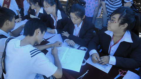 公司迎新点设在五月花广场。在这里,各学院搭起帐篷,竖起标牌,等待新生的到来。公司工作人员身着正装,显得严肃认真且精神抖擞。他们将引导新生填写各类信息,并为陪同家长提供细致入微的服务。细心观察,我们可以看到,一些新生因为紧张或是兴奋,而在填写信息的时候遇到各种阻碍,但热心负责的师姐们会第一时间帮助他们解决问题,她们温馨的笑容也舒缓了新生扣紧的心弦。迎新点的工作量是巨大的,在一天的忙碌后,工作人员的脸上往往会流露出一丝倦意。