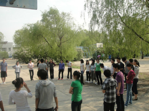 炎热的天气并没有减少大家参与的热情,约定的时间还没到,同学们便已经陆续到达了活动现场。随后,本次活动组织者张竞文、李鹏龙向在场的各位同学说明了具体的游戏项目,分别是:混合篮球赛、唱反调和“五毛一元”。紧接着,主持人李鹏龙对大家进行了分组,游戏开始!