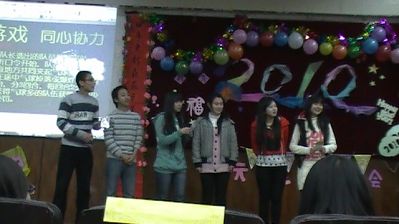 晚会开始后,全场观众按照号码牌颜色排成四队,分别是由洪桑桑、刘玉鑫带领的“粉红佳人队”,史昕、邱志伟带领的“大黄蜂队”,由康健、刘鹏耿带领的“紫霞仙子队”,程颖、梁锐义带领的“蓝皮鼠队” ,根据所组成的队伍来进行游戏。游戏共有两个环节,分别是比划猜词环节和“同心协力”夹气球环节。比划猜词环节中,“粉红佳人队”获得了第一名。在夹气球环节中,“蓝皮鼠队”获胜。最终,“粉红佳人队”以较大的优势获得了最终大奖。在紧张激烈的游戏环节中还穿插了精彩的文艺节目:4位青春靓丽的女生的开场舞《AH···》、暖冬戏剧公社精彩演绎的《快乐旅行社》、金春香唯美浪漫的长笛独奏《我心依旧》、武协潇洒帅气的武术表演、陈国阳和刘奇倾情演唱的《ASK FOR MORE》,这些独具特色又精彩纷呈的节目赢得了现场观众的阵阵掌声,现场气氛一度高涨。另外,武协会长丁韶鹏、暖冬戏剧公社总导演张航都为同学们带来了新年的祝福。