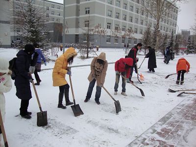 2009年11月13日至15日,长春气温下降,天气由暖日高照转为雪花飞舞。长春第一场大雪的降临让整个吉大校园穿上了洁白的雪衣,但是为了方便员工出行,学校给各学院分配了清扫路面的任务。