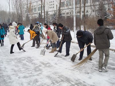 在08级各班班委的组织与带领下,尽管寒风扑面、雪花纷飞,但同学们依旧满腔热情,奋力清扫积雪,与寒风搏斗,与积雪抗争,用青春的风采给白色的冬季增添了绚丽的色彩。虽然时间紧、任务重,但是同学们在共同努力、默契配合下按时完成任务,将路面积雪清扫干净,方便同学出行,保障同学安全。