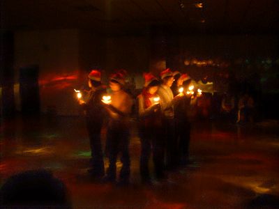 舞会在晚6时准时开始,共进行了6个项目。布置焕然一新的会场中充满了圣诞欢愉喜悦的气氛。圣诞树、圣诞老人等剪纸也为这场晚会增色不少,10位女同学手捧蜡烛缓缓入场,舞会在圣诞乐曲中拉开了序幕。主持人演说幽默,动作夸张,博得同学们阵阵掌声;同学们不时传来阵阵喜悦的笑声;其中外国友人也闻讯赶来,共度这欢乐美好的时光,老师也与同学们一起在舞池中翩然起舞。小游戏让同学们变得更加热情与疯狂起来,出其不意的口令让同学们既紧张又兴奋;踩气球游戏把气氛又推向了一个高潮,它增进了男女同学的友谊。得了奖的同学拿着奖品兴奋不已,一张张美丽的笑容被永远定格在这一刻。