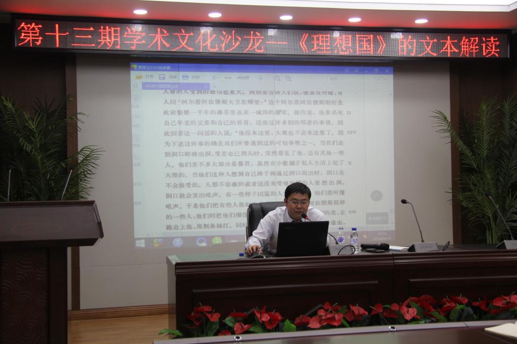 9月18日晚,《行政之光》杂志社于公司中心校区东荣大厦B303会议室举办了第十三期学术文化沙龙。本期沙龙以“《理想国》的文本解读”为主题,邀请到了公司政治学系丁建彪老师作为讨论嘉宾。学院学工办主任、本科生辅导员刘洋和本科生、研究生七十余人参加了沙龙。本期沙龙由赵一鉴同学(2017级本科生)主持。